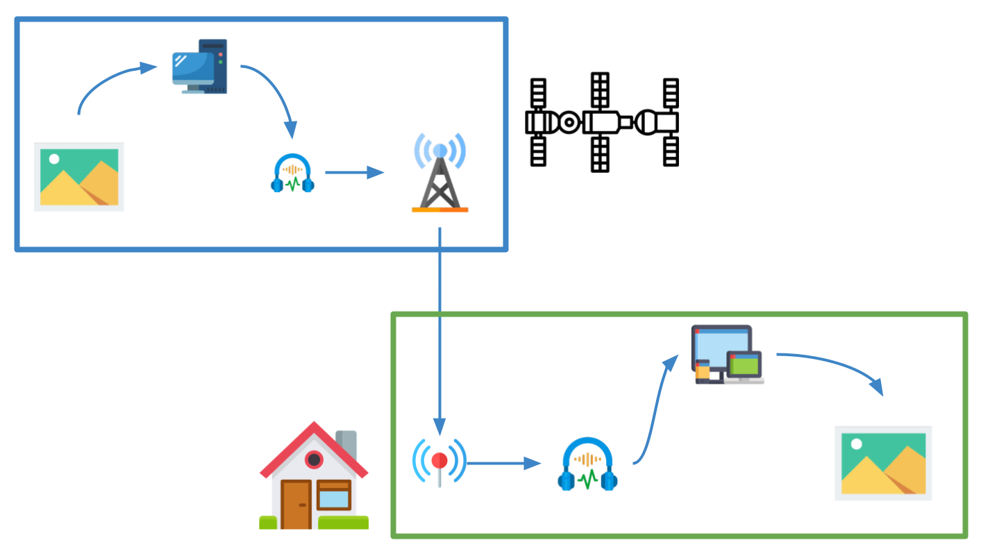 El proceso completo comienza en la Estación Espacial Internacional, dónde, a través de un ordenador un con un software específico se codifica una imagen en un archivo de sonido. Después este sonido se envía a través de radio FM, tal y como hacen las emisoras de radio, mediante una antena emisora (esta emisión está coordinada por ARISS, Amateur Radio on the International Space Station).