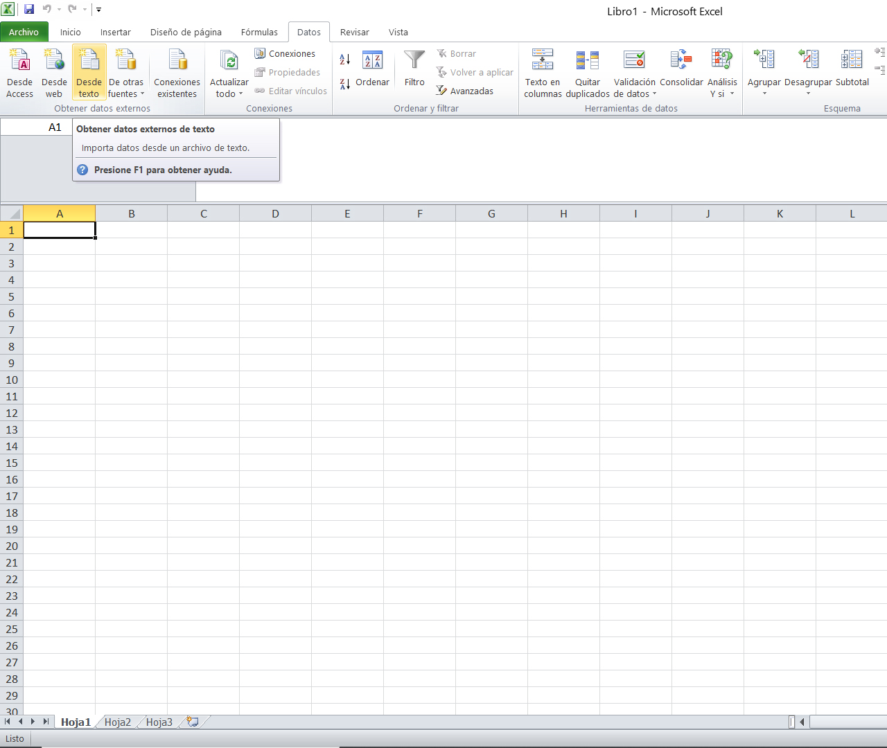 1) Abrimos una hoja de cálculo en EXCEL y en la pestalla "Datos" debemos seleccionar "Desde texto"