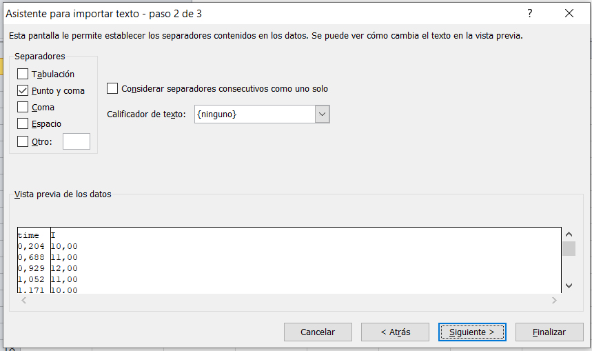 3) Se abrirá el asistente para importar texto. Haremos click en "Siguiente" para pasar al paso 2. Ahí debemos marcar la opción "Punto y coma" y hacer clic en "Siguiente" para continuar. En este último paso pulsaremos en "Finalizar"