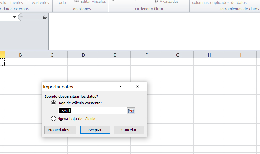 4) Seguidamente nos aparecerá una ventana para que indiquemos dónde queremos importar los datos. Pulsaremos en "Aceptar" para iniciar la importación.