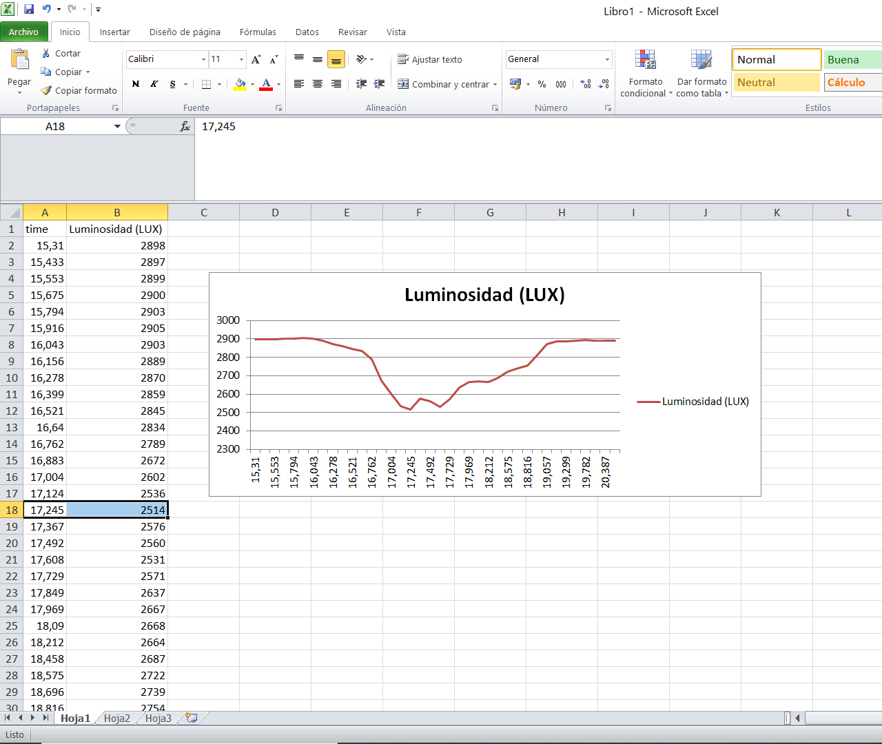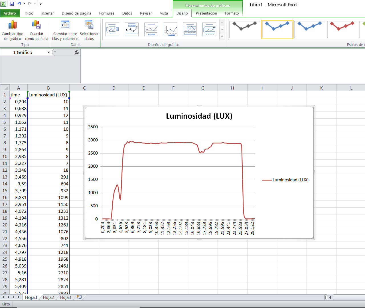 5) Obtendremos dos columnas con datos, una con el tiempo en segundos y otra con la luminosidad en lux. Si quieres puedes crear un gráfico para visualizarlos mejor.
