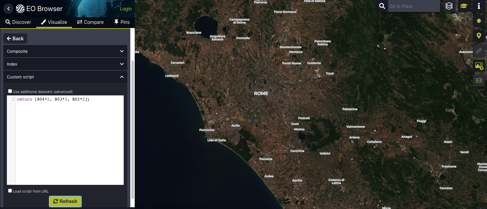 Paso 3: Para mejorar la calidad de la imagen, multiplicamos cada banda por un número, por ejemplo por 2. Esto añade brillo y contraste entre las bandas, proporcionando una imagen de mejor calidad.