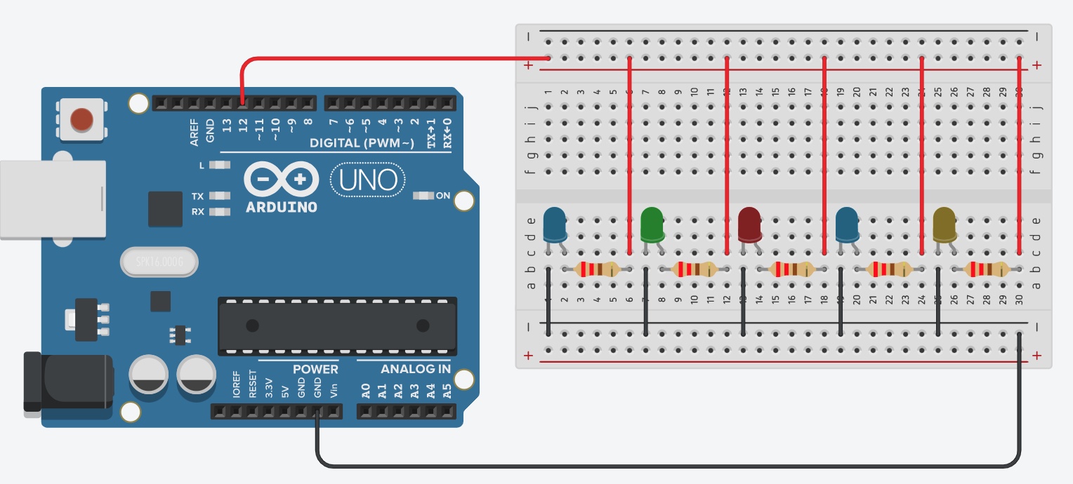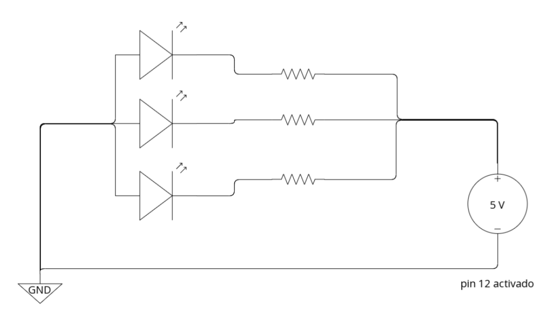 En el video se muestra cómo poner LEDs en serie, es decir uno de tras de otro y que solo haya un cable hacia GND y otro cable hacia la resistencia y el pin 12.