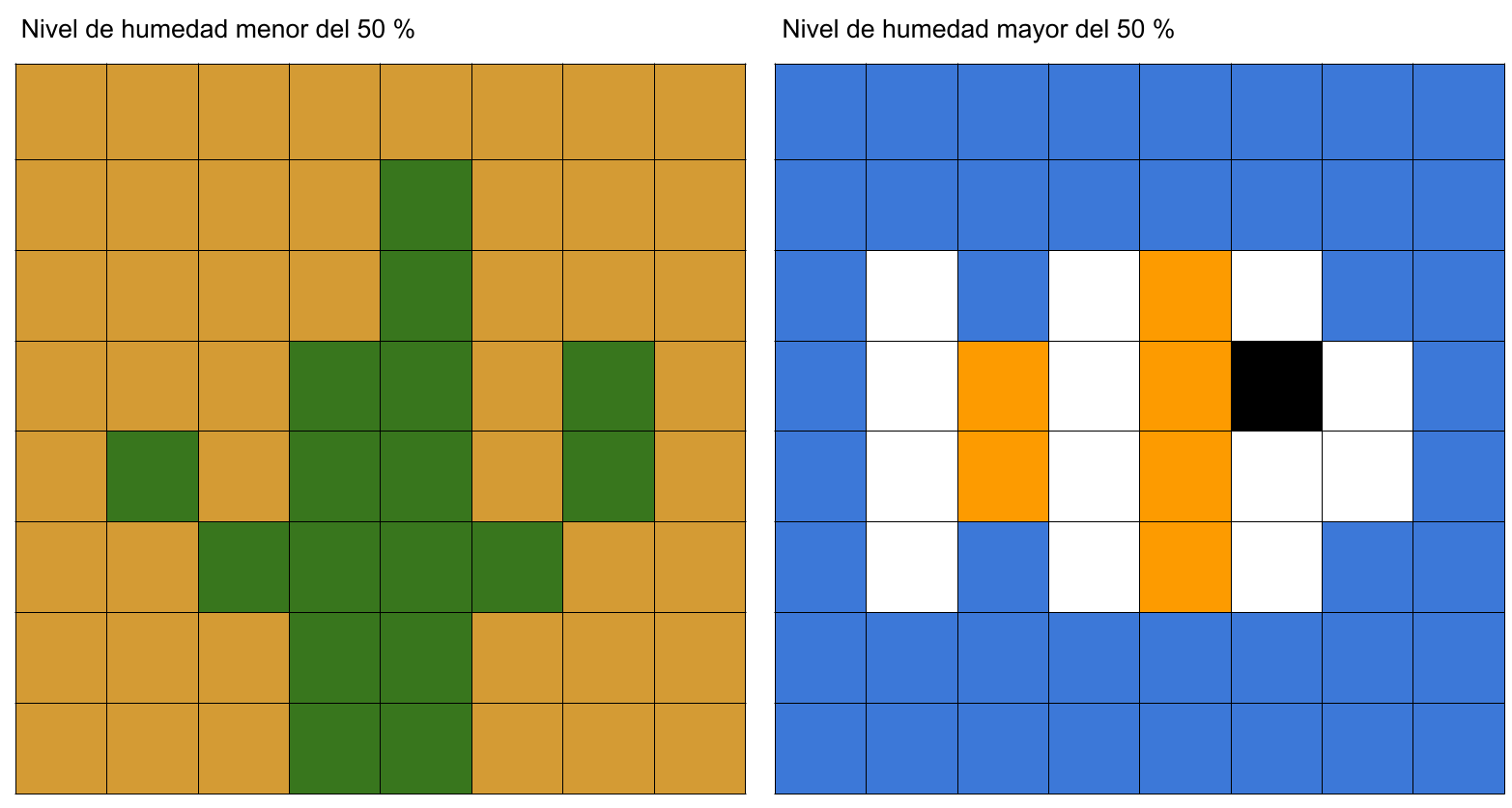 Un ejemplo para hacer este reto es crear dos imágenes, una que se muestre cuando el nivel de humedad sea menor del 50 % y otra que se muestre cuando el nivel de humedad sea de más del 50 %.