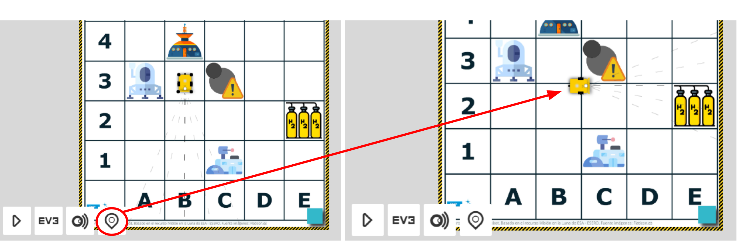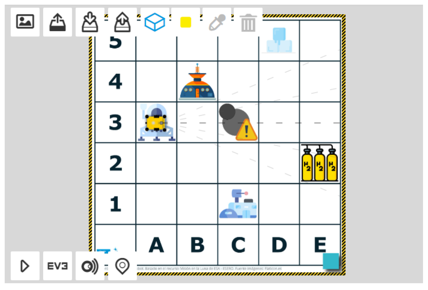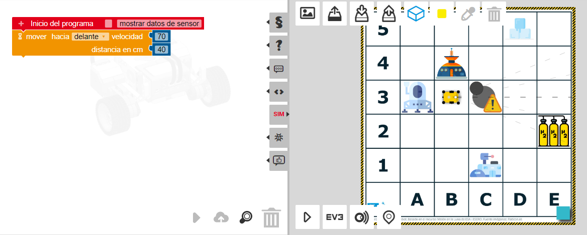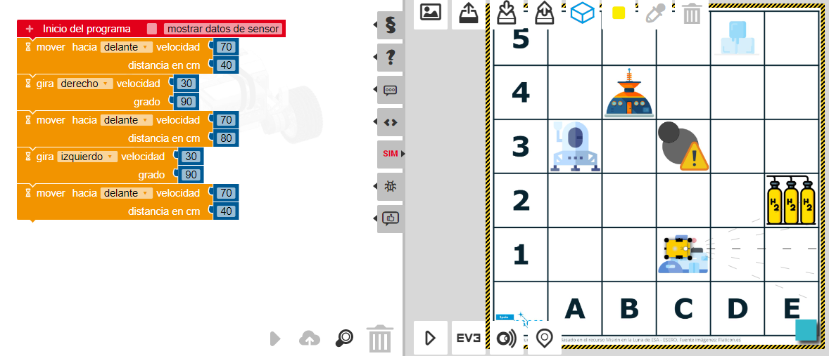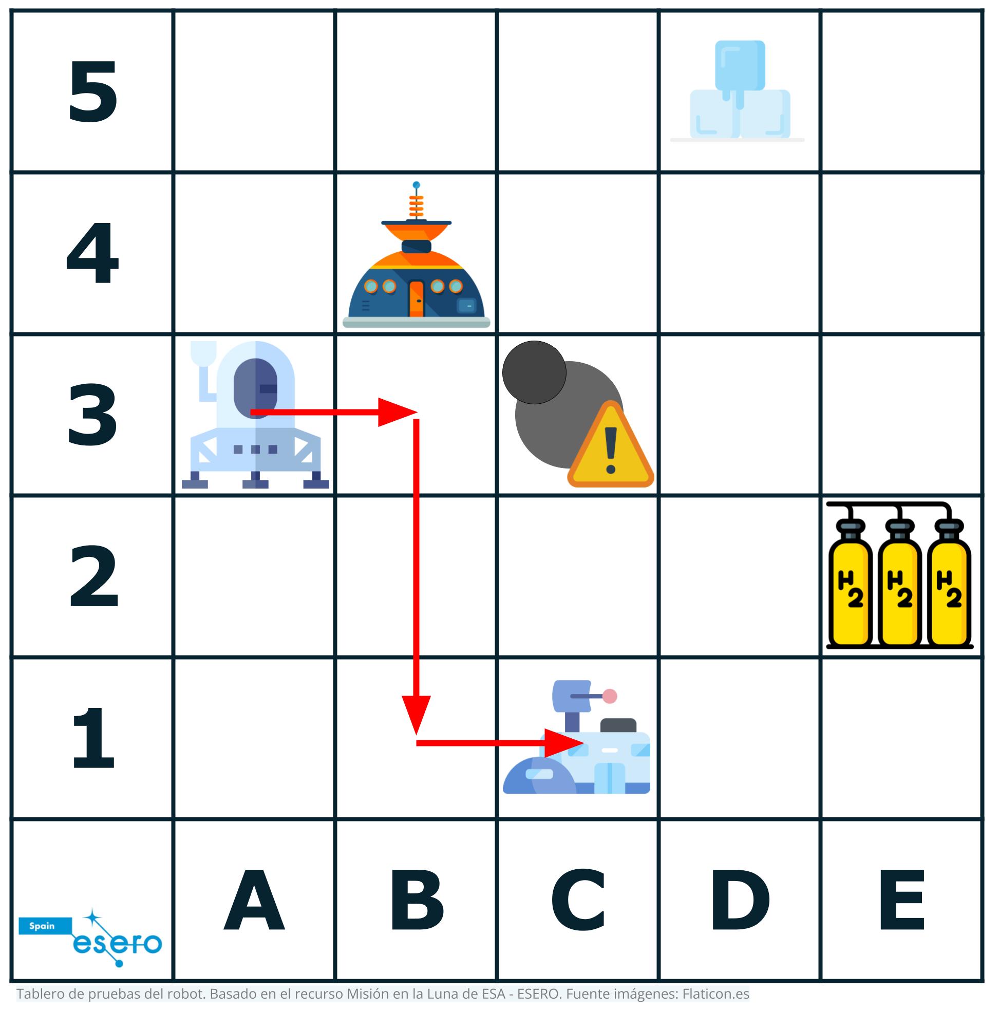 Objetivo: Tenemos que programar nuestro robot para que vaya desde el punto de aterrizaje (A3) a la base Lunar (C1), por tanto, nuestra misión es: