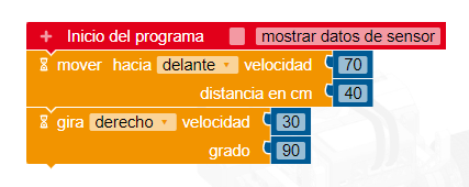 Insertar un bloque de movimiento hacia delante, y hacer pruebas para saber qué distancia necesita recorrer para llegar a la siguiente casilla. Una velocidad del 70 % es aceptable. La distancia a recorrer para llegar a la siguiente casilla depende del equipo y tamaño de pantalla que estemos utilizando. Realiza varias pruebas para encontrar la distancia correcta.