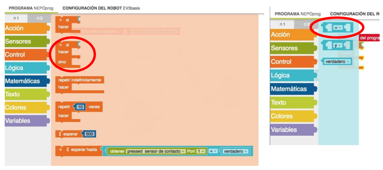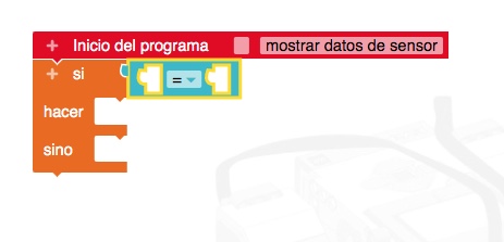 Este bloque está dentro de 'Control'. Para saber cuál es el estado de nuestro sensor de color, tenemos que añadir en la línea del SI, un bloque lógica.