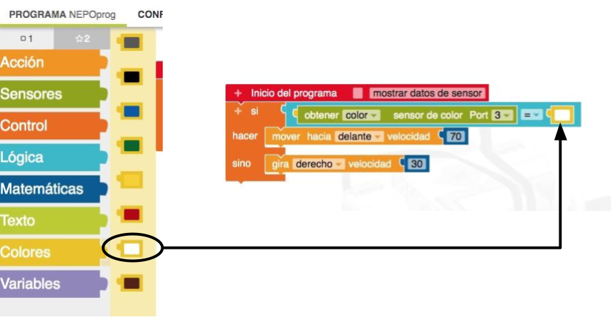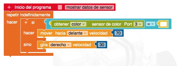Tenemos que incluir el bloque 'obtener el color del sensor de color', y poner que sea igual a blanco. A continuación, añadimos los bloques de movimiento: