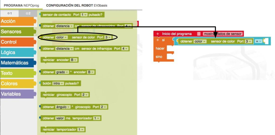 3. Añadir el bloque para comprobar el estado del sensor de color