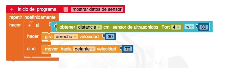 Vamos a programar el robot para que esquive todos los obstáculos. Necesitamos crear un bucle, en el que nuestro robot está comprobando siempre si su sensor de ultrasonidos detecta algún obstáculo; y si lo detecta, reaccionar ante ese obstáculo, girando. Nuestra distancia de seguridad es de 30 cm, nuestro robot no puede acercarse más a un obstáculo.