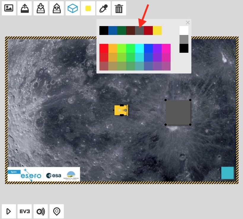 Haz clic en el botón 'añadir obstáculos' de Open Roberta Lab y añade uno al entorno de simulación. Puedes cambiarlo de color, haciendo clic en 'colores'. En este ejemplo, hemos cambiado el color a gris. También puedes cambiarlo de sitio y cambiar su tamaño.