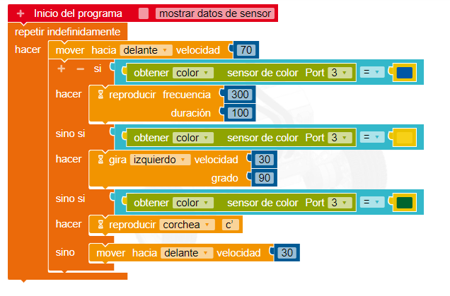 Hemos programado nuestro robot para que haga tres acciones diferentes dependiendo del color que detecte: